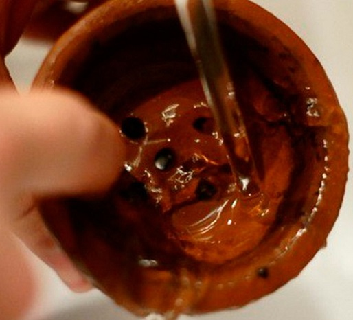 Необходимо поместить чашу на печь, строго ножкой вверх. Должна быть такая температура, чтобы сироп закипел. После этого он начнет выгорать, выделяясь наружу. Это обладает высокой эффективностью, почти стопроцентно удаляя ненужные вещества.