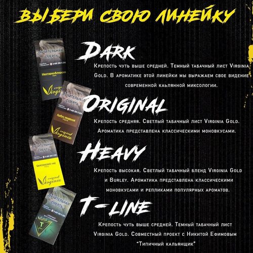 Ароматы линейки порадуют знатоков кальянных вкусов привычными классическими композициями, но с оригинальной подачей от Virginia Original. Кроме того, в Heavy перекочевали вкусы из других линеек, став более крепкими и насыщенными. Нуждается в низкотемпературной варке.