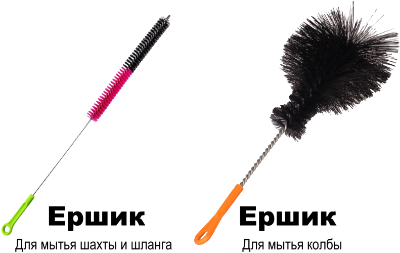 - Ёрш для мытья колбы. Он имеет жёсткую и гнущуюся основу для того, чтобы можно было добраться до самых труднодоступных мест. Эти ёршики универсальны и подходят для любого вида колб, независимо от их размера и формы.