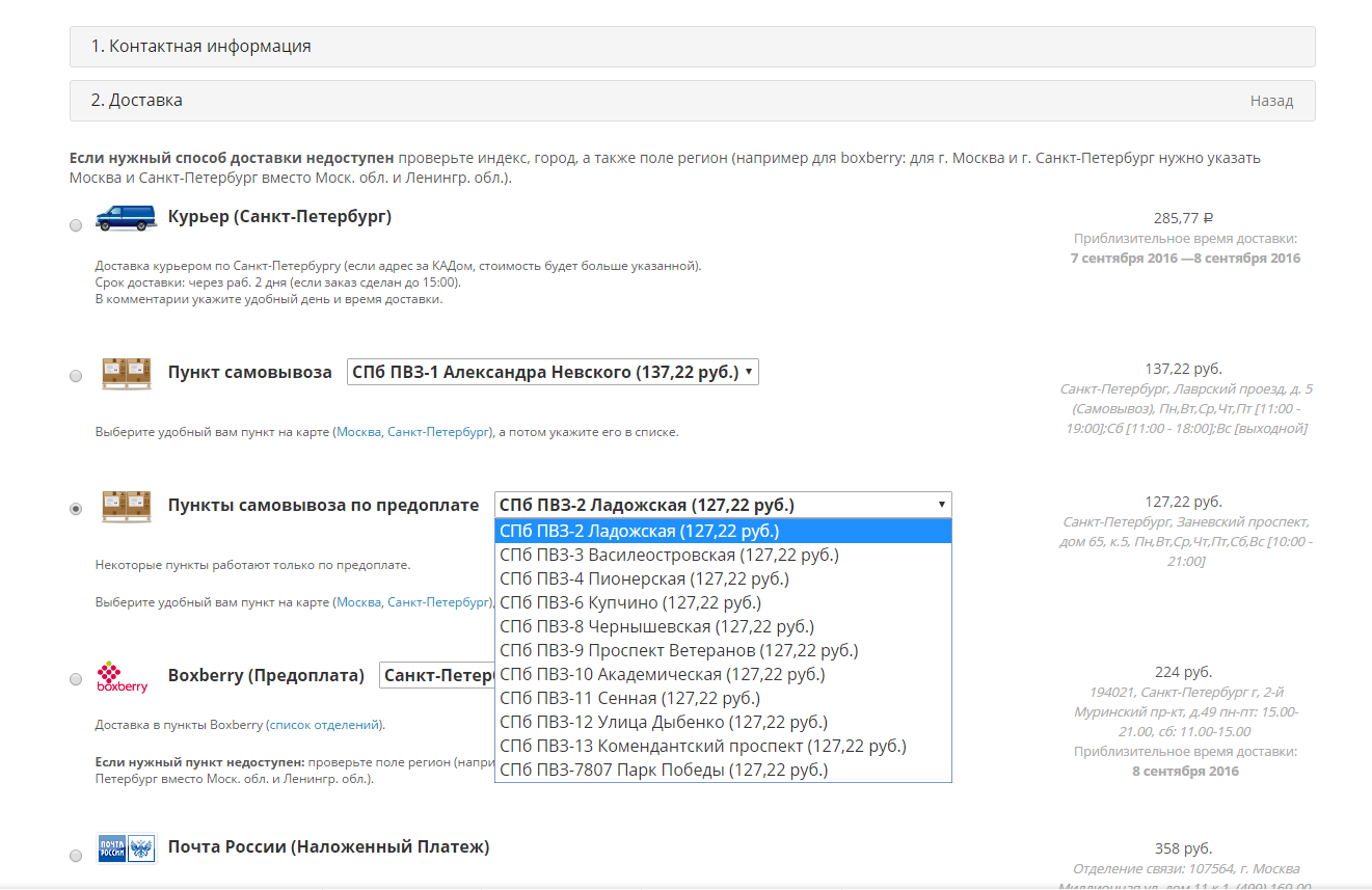 Для удобства мы выделили эти пункты самовывоза в отдельный способ доставки: